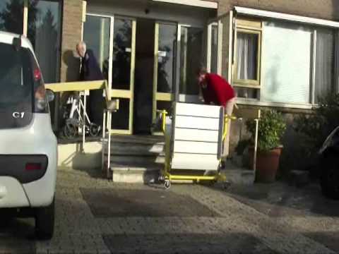 Mobile Rampe mit Trolley Diese einzigartige mobile Rampe ist für die zeitweilige Überbrückung eines größeren Höhenunterschiedes bis zu 1 meter sehr anwenderfreundlich. Dank des Trolleys ist die Schräge einfach zu bewegen. Die Rampe ist so konstruiert, dass diese sowohl von oben aus, d.h. vom höchsten Punkt aus, als auch von unten aus, d.h. vom niedrigsten Punkt aus, aufgebaut werden kann. Die Rampenteile sind auf einem fahrbaren Trolley zu einer vollständigen Rampe montiert. Der Trolley hat eine dreifache Funktion: Das Aufbewahren und das Bereitstellen der ausklappbaren Rampenteile und das Unterstützen der Rampe, sowie diese für den Gebrauch ausgeklappt wird. Der Träger auf dem Trolley ist in seiner Höhe verstellbar. Die Rampenteile können mit einer Handbewegung abgenommen werden. Damit kann die gesamte Rampe in drei Teile zerlegt werden. Auf diese Weise ist es möglich, die Rampe und den Trolley in Gebäuden sowohl oben als auch unten aufzubewahren, weil unten oft nicht genug Raum vorhanden ist, um die Rampe aufzubewahren. Das Ein- und Ausklappen der Rampenteile kann mittels weniger Handgriffe von einer Person ausgeführt werden. Diese mobile Rampe ist aus leichtgewichtigen anodisierten Aluminiumprofilen hergestellt. Die Lauffläche ist mit einer gleitsicheren Oberfläche ausgestattet. Zwischen jedem Profil befindet sich ein Verbindungsprofil mit Regenrinne. Der Trolley ist aus Stahl hergestellt und mit einem Pudercoating abgearbeitet. Der Träger ist aus rostfreiem Stahl hergestellt. Es sind vier robuste Räder anmontiert. Zwei Räder davon sind schwenkbar und mit einer Bremse ausgestattet. Abmessungen: breite 78cm zwischen Radabweiser Länge 300 - 400 - 500 cm